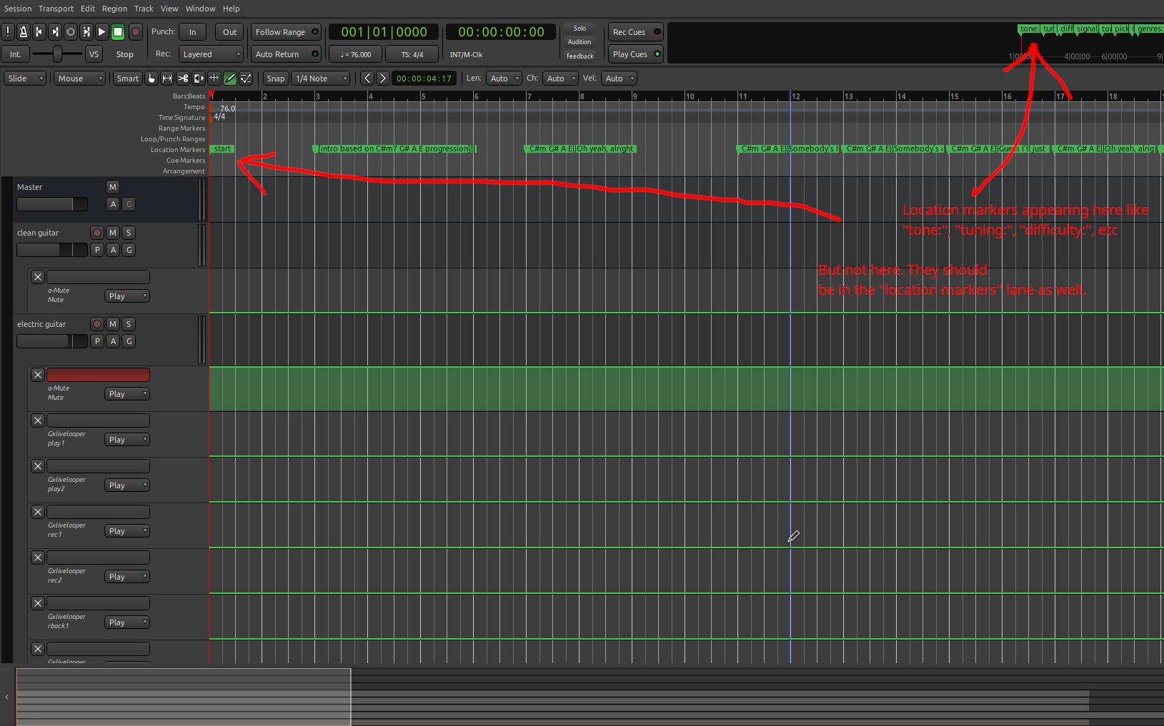 | Additional Information | I may have generated these location markers with a script or something, not organically through Ardour... BUT if they appear in one place they should appear in another. And if they don't appear in one place, they should not appear in the other. having them appear in one but not the other is bad, right? | ||||
