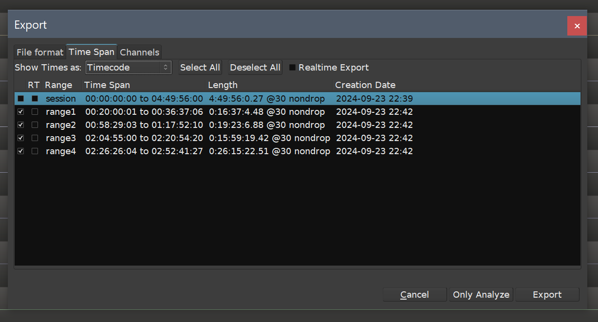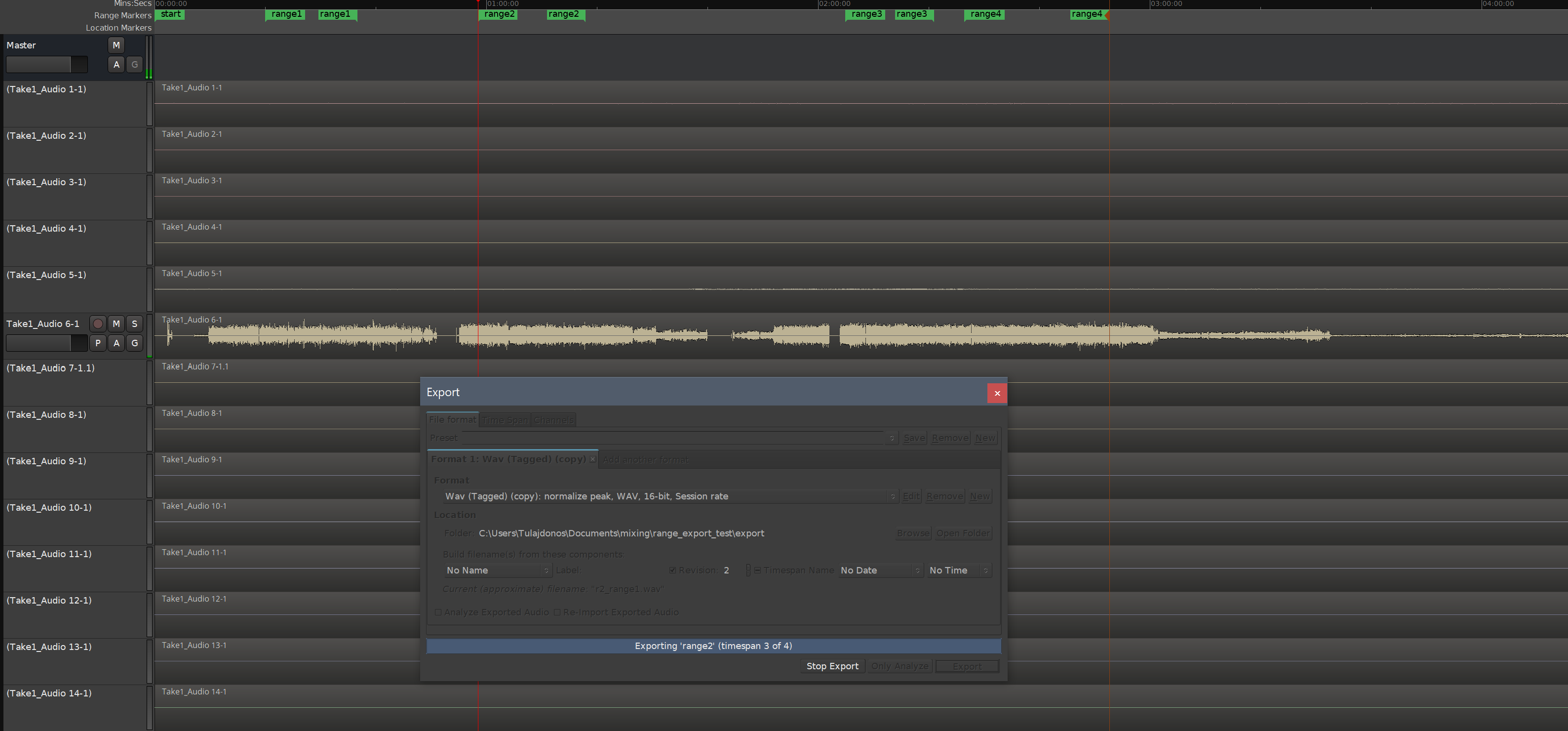 Do you mean exporting Ranges aka Time spans (not Regions) like in attached screenshot? initiated via Session > Export > Export to Audio file? So how can I reproduce this? Is this step by step recipe correct? * new Session * create 3 range markers * Session > Export > .. to audio file * File format: wav 16bit, session-rate, normalize to peak *Time span: select timespan 1 and 3 * Export And yes, to normalize first the raw data needs to be written to a temporary file. That can then be analyzed to find peak volume before writing the actual file. |