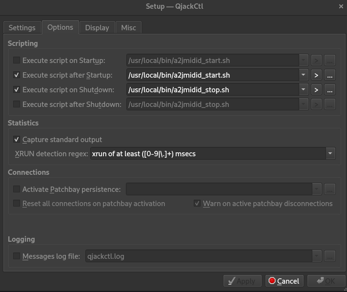 The 'libjack.so.0' on my system resides in several places: /opt/Ardour-8.7.0/lib/backends/libjack_audiobackend.so /usr/lib64/libjack.so.0 -> libjack.so.0.1.0 /usr/lib64/libjacknet.so.0 -> libjacknet.so.0.1.0 /usr/lib64/libjackserver.so.0 -> libjackserver.so.0.1.0 /usr/lib64/libjacknet.so.0.1.0 /usr/lib64/carla/jack/libjack.so.0 /usr/lib64/ardour7/backends/libjack_audiobackend.so /usr/lib64/ardour8/backends/libjack_audiobackend.so /usr/lib64/ardour6/backends/libjack_audiobackend.so /usr/lib64/libjack.so.0.1.0 /usr/lib64/libjackserver.so.0.1.0 The 'ld.so' I found here: /var/lib/flatpak/runtime/org.fedoraproject.Platform/x86_64/f40/0558a48ff9656735d27548f7294dc967d0af356b07a85d9f75c44371177cd688/files/bin/ld.so -> ../../lib64/ld-linux-x86-64.so.2 /var/lib/flatpak/runtime/org.kde.Platform/x86_64/5.15-23.08/4d49c450514df9f8cfa5fe1a83b9e5cebe1fc2c9b958e8cabe4b1a23f4068d7c/files/bin/ld.so -> ../../lib64/ld-linux-x86-64.so.2 /var/lib/flatpak/runtime/org.freedesktop.Platform/x86_64/23.08/cb2bd72f6b227a6ef91c194b21880d95bee4e198c4ab7cb0fa7bea30649338ae/files/bin/ld.so -> ../../lib64/ld-linux-x86-64.so.2 /var/lib/flatpak/runtime/org.freedesktop.Platform/x86_64/24.08/3eead0add96eea28fd9115c3e49eff55503edf7b2d1c543bc16d89a35fcddfb8/files/bin/ld.so -> ../../lib64/ld-linux-x86-64.so.2 /var/lib/flatpak/runtime/org.gnome.Platform/x86_64/46/74236c76699850cdc61473b49bc913595c6f37d14bc008283f63a241e9c2b4ce/files/bin/ld.so -> ../../lib64/ld-linux-x86-64.so.2 /var/lib/flatpak/runtime/org.gnome.Platform/x86_64/47/eea557953da31f9e8d3f1881bfe4c645be8229191589fc6b41db068ddfcc8cec/files/bin/ld.so -> ../../lib64/ld-linux-x86-64.so.2 /var/lib/flatpak/runtime/org.freedesktop.Platform/x86_64/22.08/89f5b42b081f8cfcf7fbb1d858b82af06fe19681e6f6ea4c3b769dcb6c1ac295/files/bin/ld.so -> ../../lib64/ld-linux-x86-64.so.2 /usr/bin/ld.so -> ../../lib64/ld-linux-x86-64.so.2 True is, that I tried to start Ardour8 without external 'jackd' and also tried to choice "internal" 'jack/pipewire' and it starting without crashing. Over here I am only missing possibility to start or stop a script automatically for enable or disable 'a2jmidid' as I am using USB MIDI keyboard (KEYSTATION 49MK3). The 'a2jmidid' ensure keyboard are connected to 'jackd' and offer for other applications to use it. In 'qjacktl' I have option in Scripts for starting and stopping this automatically. |