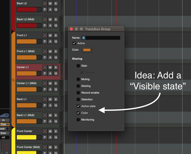 | Description | Heyo, It would be very convenient to toggle the visibility of entire groups. Thus, Right-click -> Hide would hide ALL tracks/buses within that group if something like "Visible state" was/is enabled for the group. | ||||